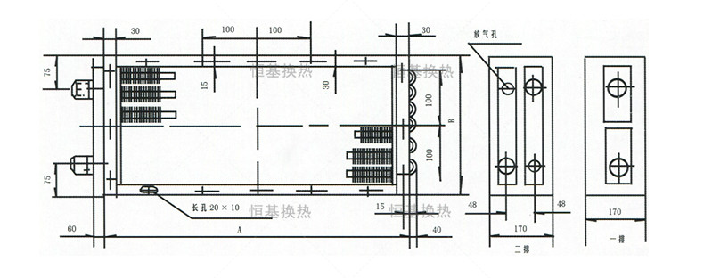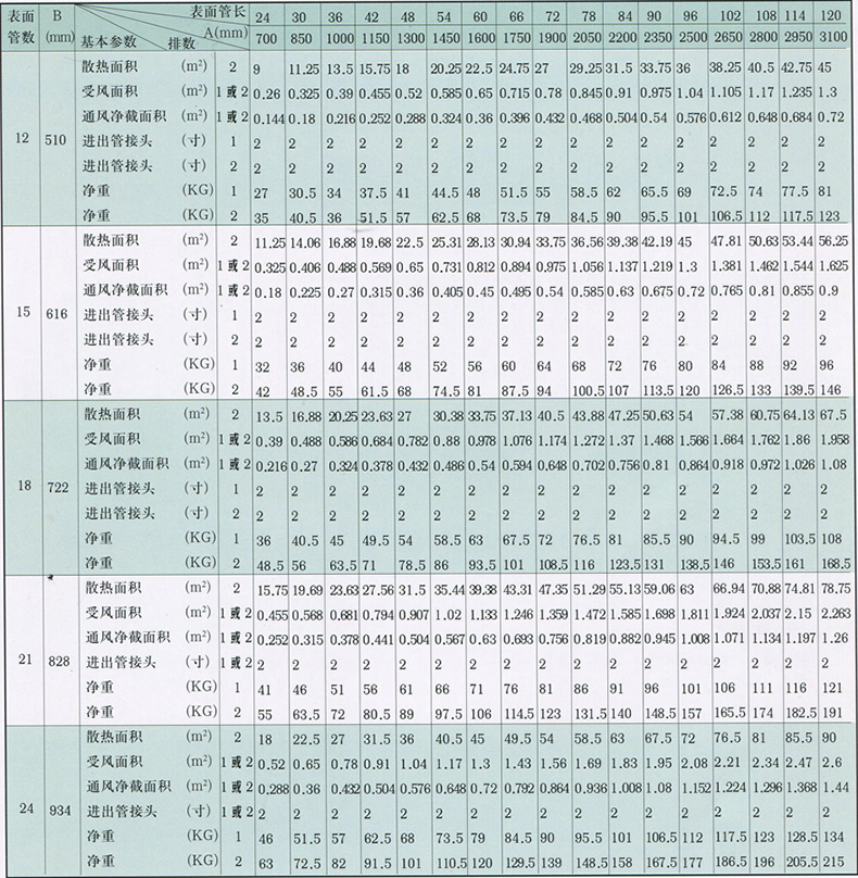 UⅡ型蒸汽散熱器有各種不同表面管長、管數(shù)、排數(shù)及翅片片距的多種配合,計有大小規(guī)格七百六十五種。